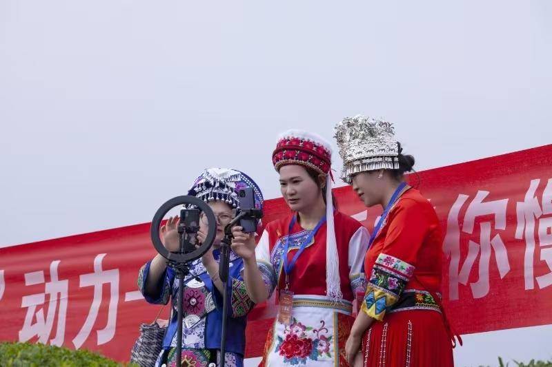 (圖為:漁山源生態(tài)農業(yè)有限公司創(chuàng)始人張靜(中)開直播帶貨)