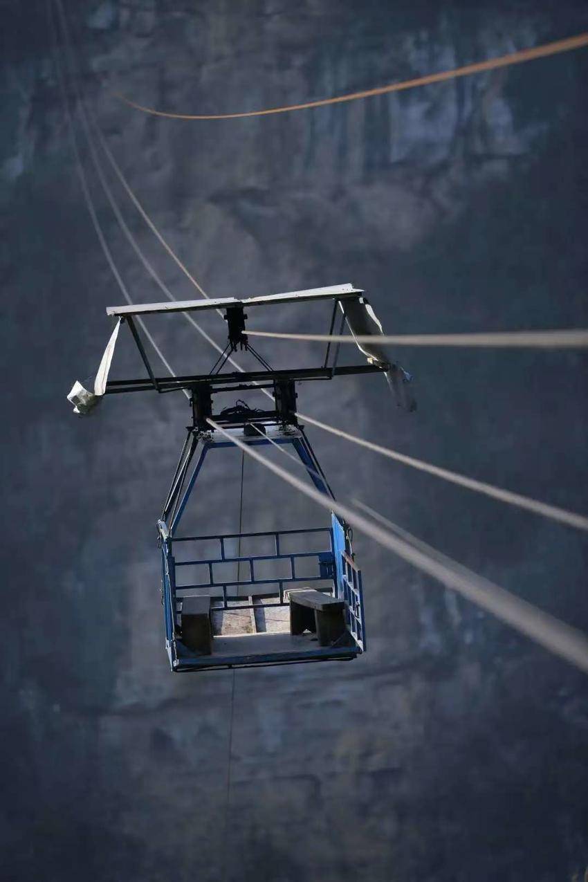 (圖為:漁山村村民坐上距離谷底500多米的懸索出山)