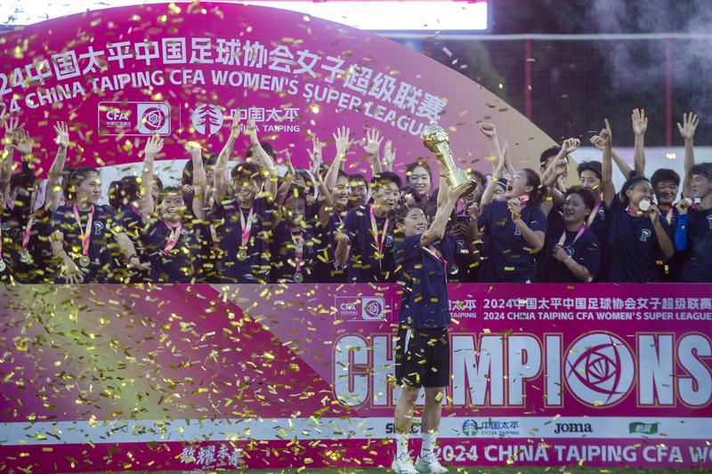 2024中國足協(xié)女超聯(lián)賽,武漢車谷江大隊(duì)連續(xù)第五次獲得女超冠軍。圖為球員姚偉(前)在頒獎(jiǎng)儀式上舉起獎(jiǎng)杯。新華社記者 伍志尊 攝