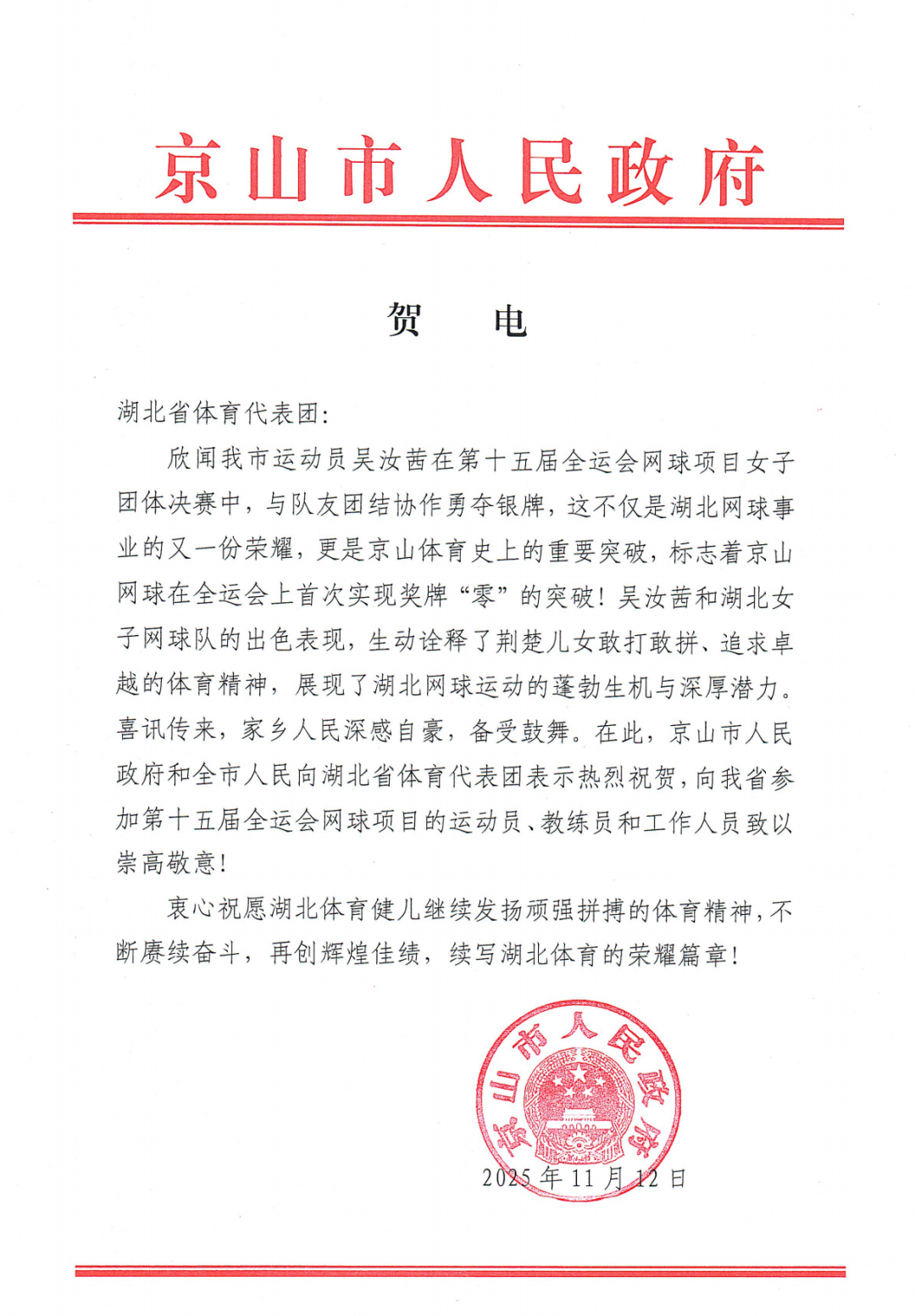 中共京山市委、京山市人民政府在賀電中表示,吳汝茜和湖北女子網(wǎng)球隊(duì)的出色表現(xiàn),“標(biāo)志著京山網(wǎng)球在全運(yùn)會上首次實(shí)現(xiàn)獎牌‘零’的突破”,并寄語她繼續(xù)發(fā)揚(yáng)拼搏精神,續(xù)寫湖北網(wǎng)球的榮耀篇章。