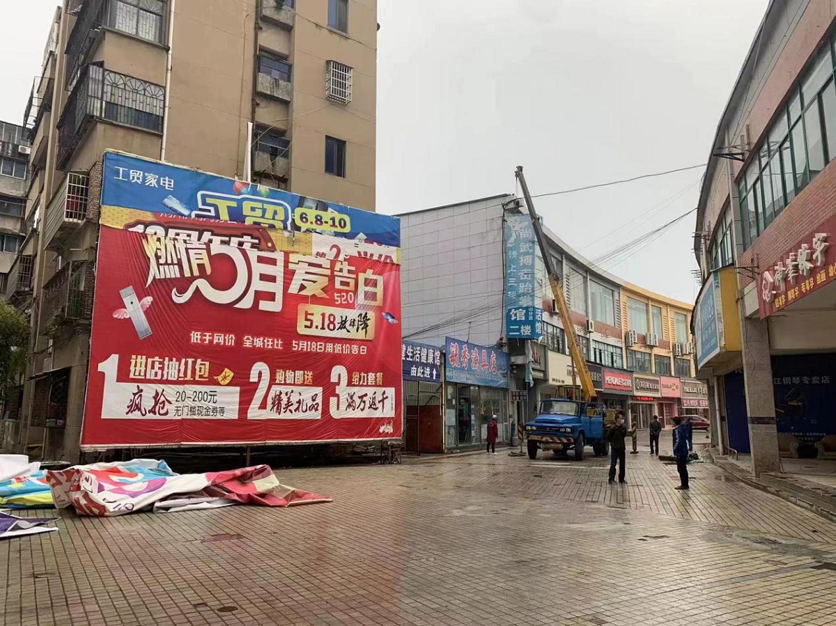 (拆除破損裝飾物)近日,市城市管理綜合執(zhí)法大隊(duì)督察人員在日常巡查時(shí),發(fā)現(xiàn)新市大道花壇內(nèi)電線桿上的中國(guó)結(jié)破損嚴(yán)重、輕機(jī)大道有墻體戶外廣告牌幾近脫落,有砸到過(guò)往行人車輛的可能,立即聯(lián)系大隊(duì)增派人員到現(xiàn)場(chǎng)進(jìn)