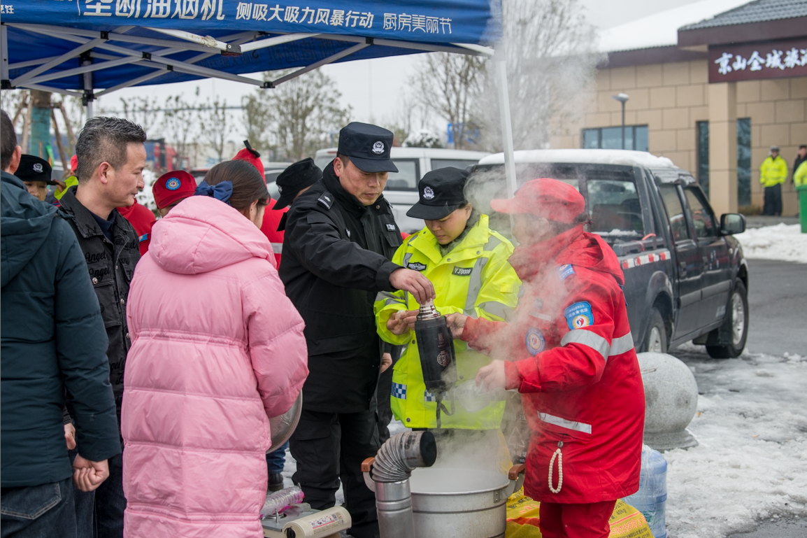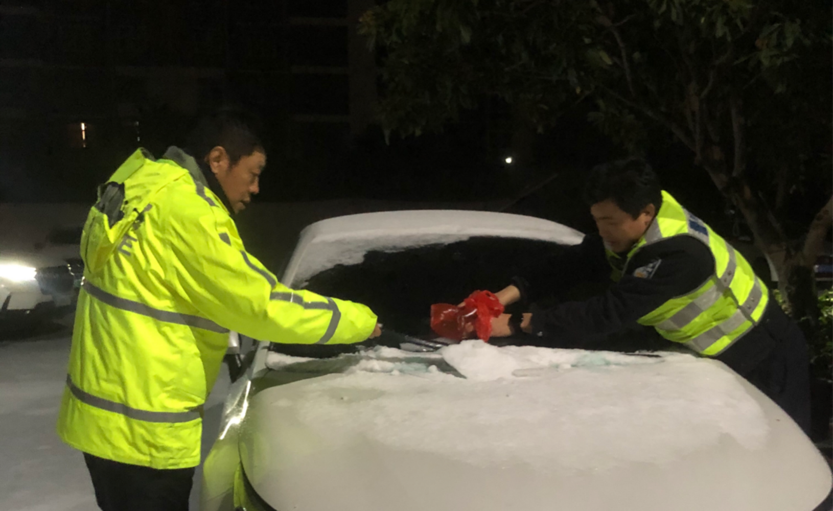 根據(jù)市委、市政府統(tǒng)一部署,我市統(tǒng)籌集中社會各界力量,全力以赴在高速、國道沿線開展融雪除冰、疏堵保暢、安置旅客等“敲窗行動”,確保全市高速路段及主要干道安全暢通?!俺袟鳌绷x警幫群眾裝開水2月6日上午,市