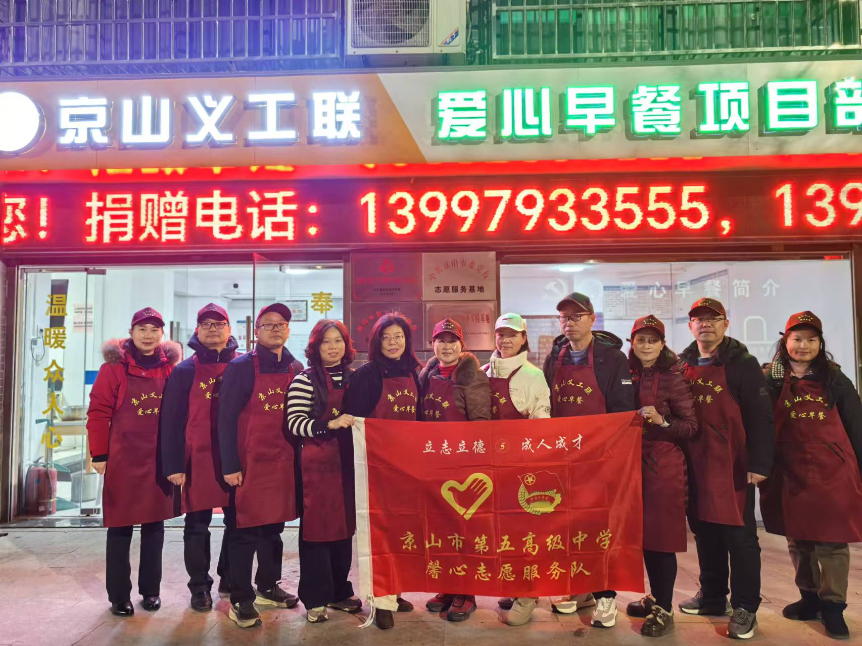 1月10日,市政協(xié)副主席、京山五中校長黃山花個人出資為京山市的環(huán)衛(wèi)工人捐贈了一日“愛心早餐”,并組織京山五中的教職工參與了志愿服務(wù)。凌晨5點半,京山五中的志愿者們穿著志愿者專屬的紅馬甲,早早來到“愛心...