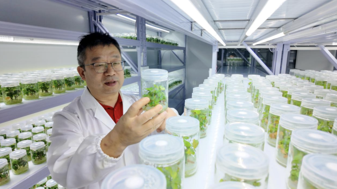 蔡興奎在紅安瑞灃紅薯組培脫毒種苗繁育中心察看紅薯組胚苗生產(chǎn)情況。