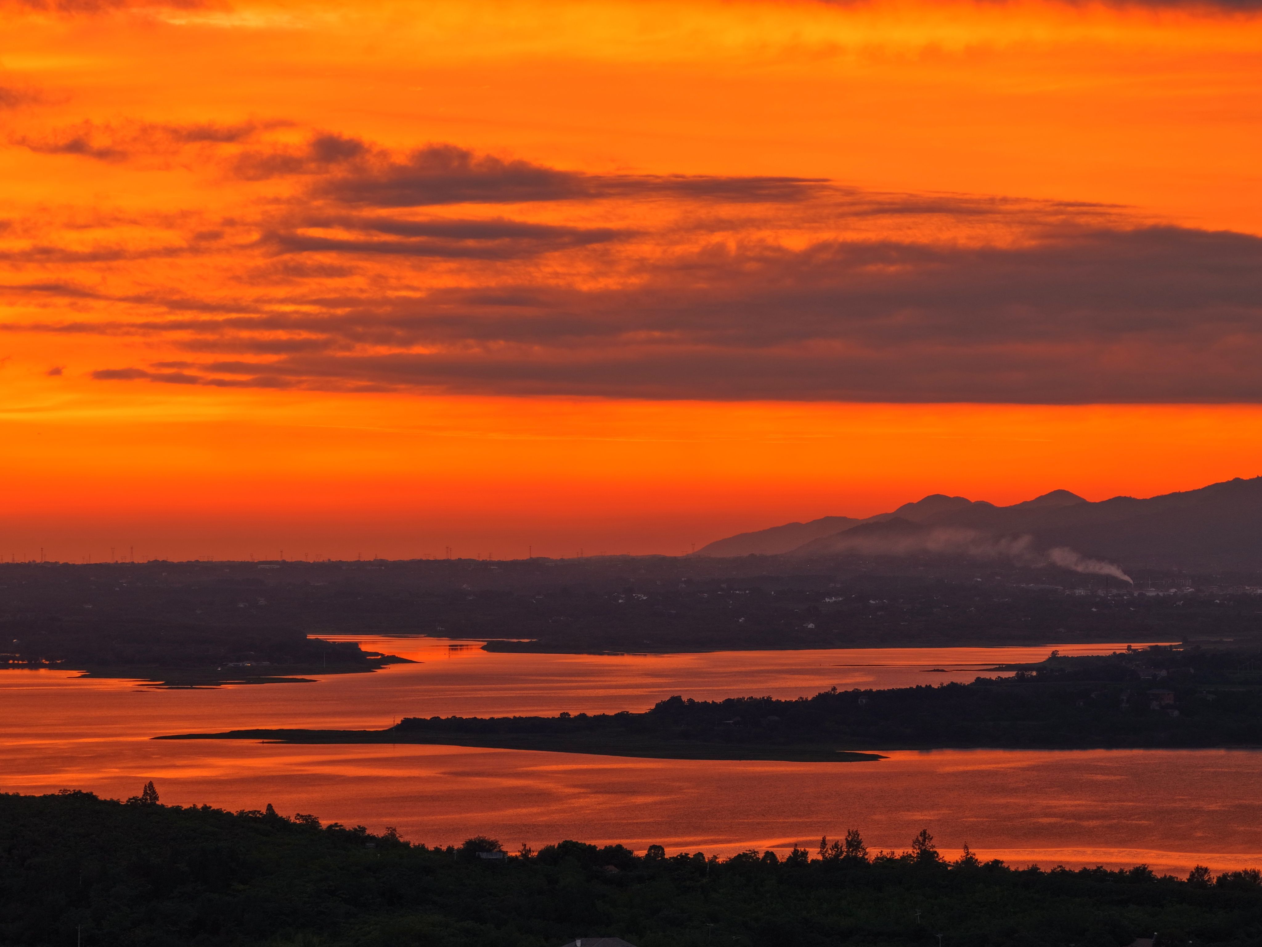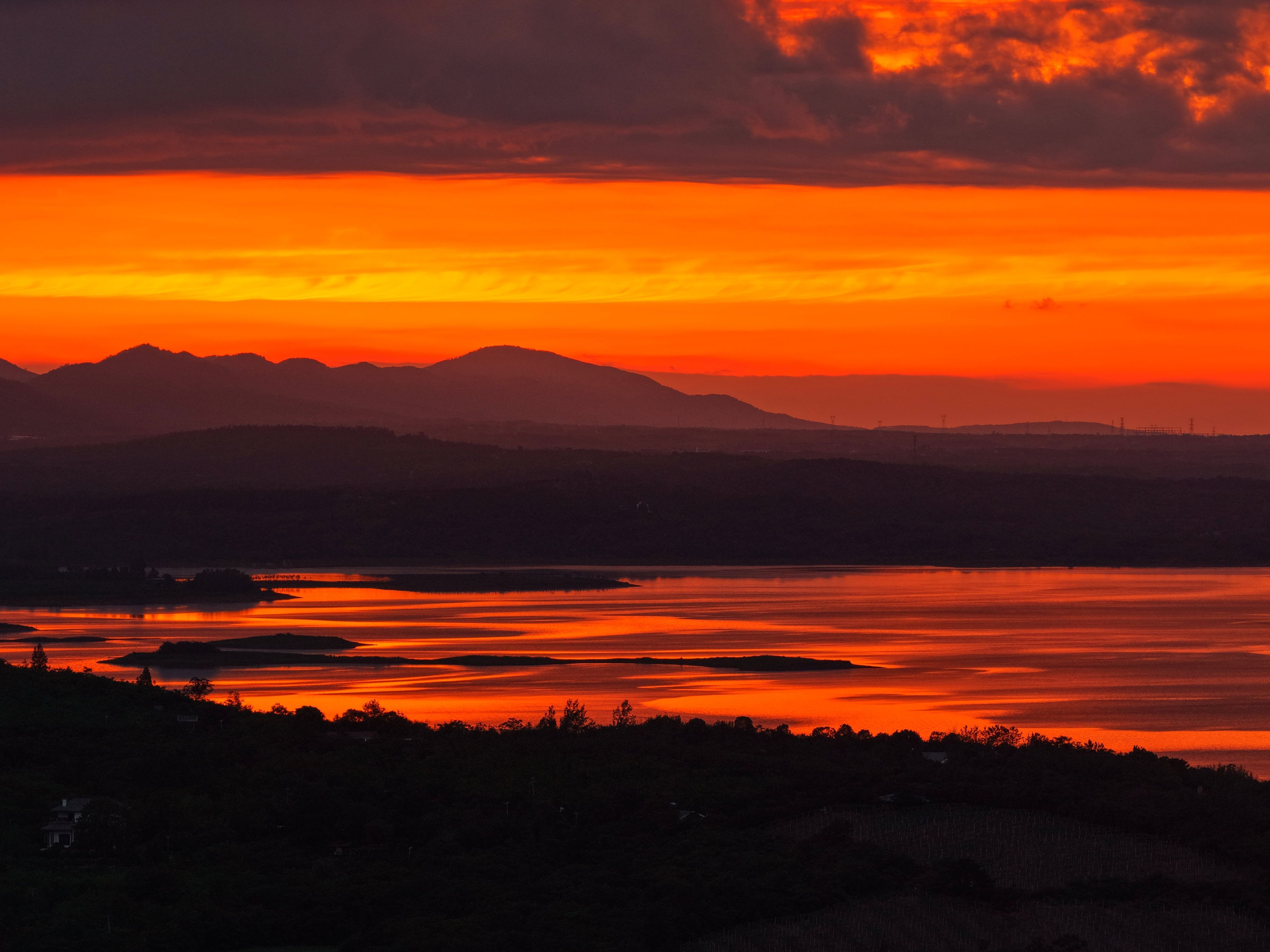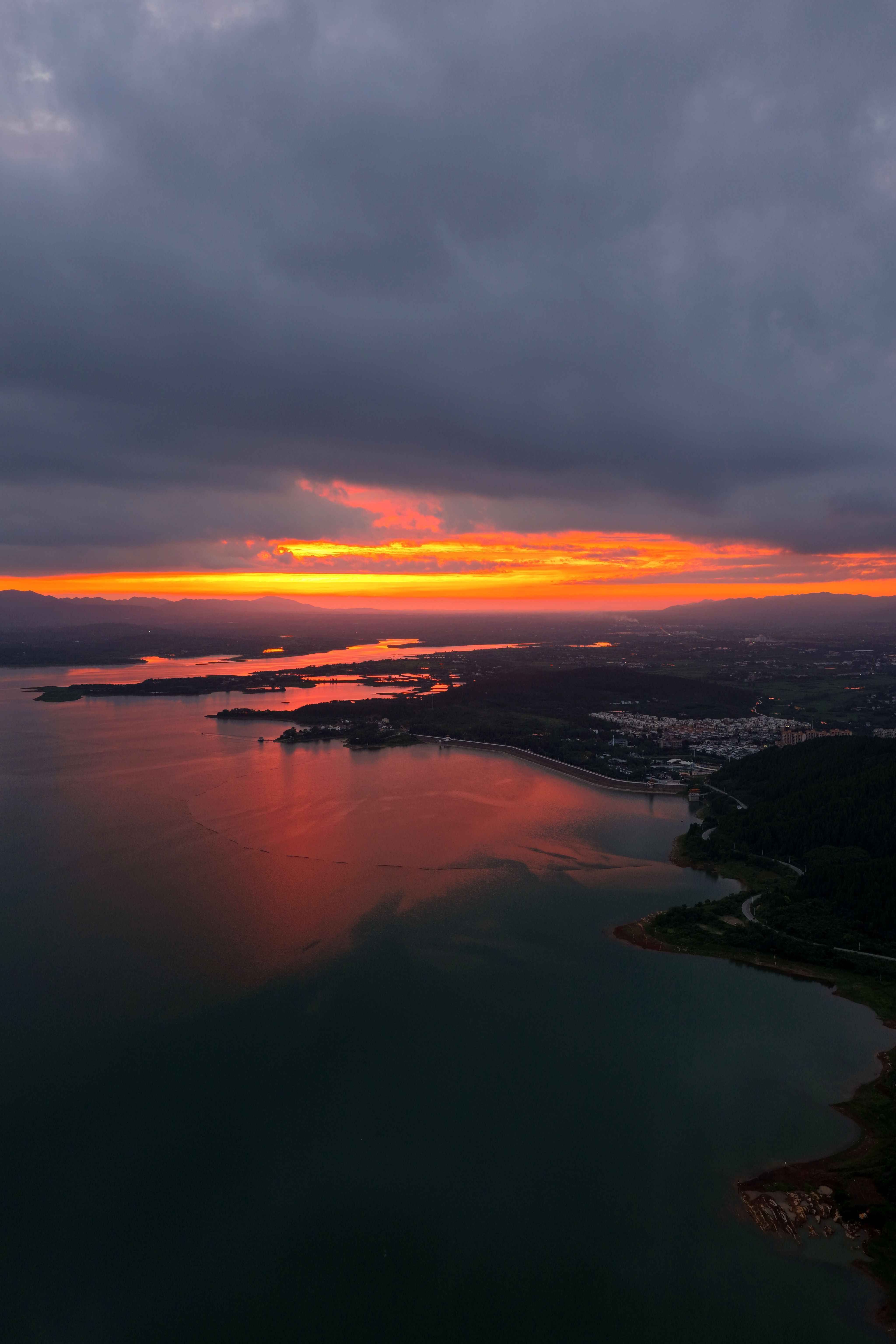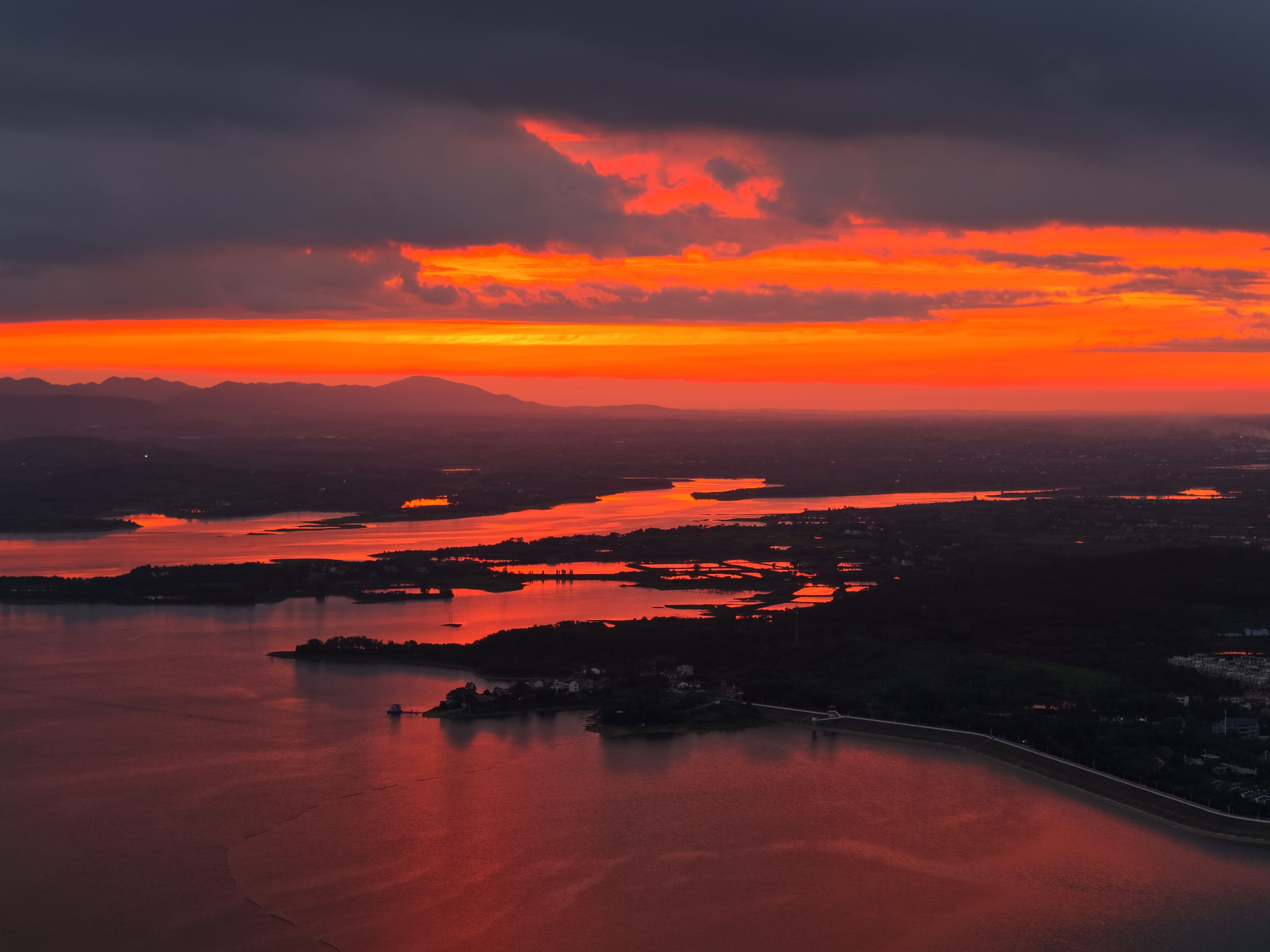 當天傍晚時分,夕陽西下,天空的顏色逐漸變紅,橙紅、玫瑰紅、紫紅等多種色調相互交融,如夢似幻,猶如一幅巨大的、色彩斑斕的油畫懸掛在天際。惠亭湖宛如一面巨大的鏡子,將這迷人的晚霞毫無保留地倒映在湖面上,整個湖面瞬間被染成了紅色,波光粼粼,與天上的晚霞交相輝映,構成了一幅絕美畫卷。(肖朕天)