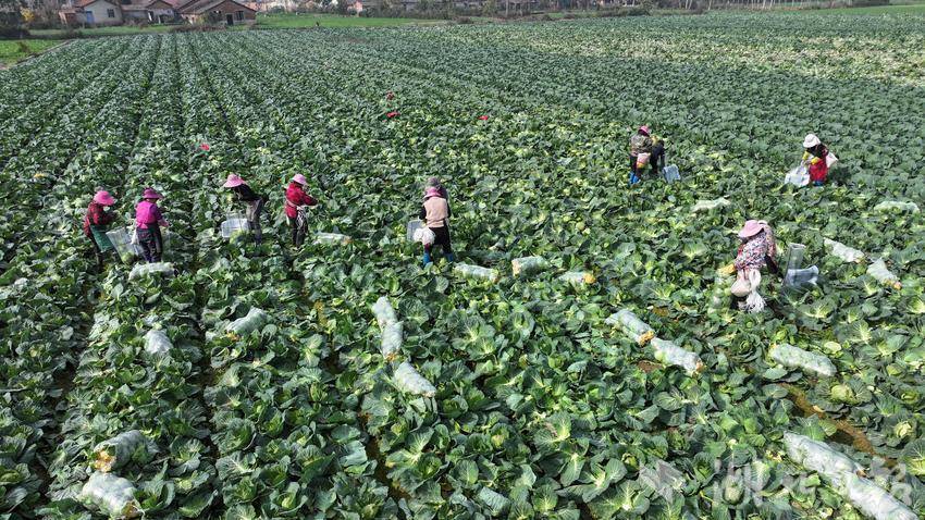蔬菜地里,農(nóng)戶們彎腰采摘,打包搬運,繼而裝車,一氣呵成;田埂上,“鄂R”牌照的物流車載著甘藍、菜薹、雪里蕻等蔬菜,蓄勢待發(fā)。