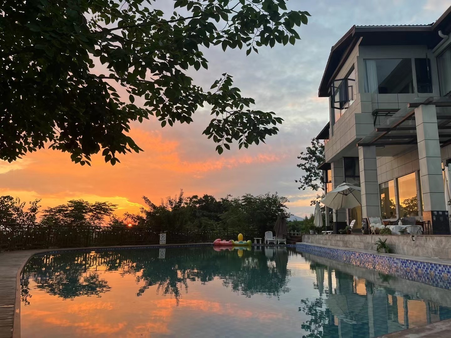 陽光從三面落地窗灑進大廳,角落里擺著精致的小物件。窗外,清澈的游泳池和湛藍的天空正好“登對”。池邊,立著手機直播支架,鏡頭里村頭的山嵐和稻田“觸手可及”。
