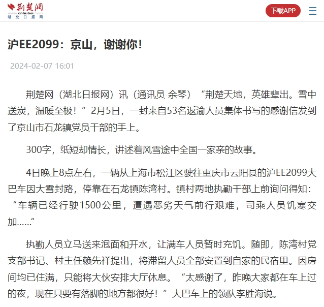 荊楚網(wǎng)(湖北日?qǐng)?bào)網(wǎng))訊(通訊員 余琴)“荊楚天地,英雄輩出。雪中送炭,溫暖至極!”2月5日,一封來自53名返渝人員集體書寫的感謝信發(fā)到了京山市石龍鎮(zhèn)黨員干部的手上。300字,紙短卻情長,講述著風(fēng)雪途中