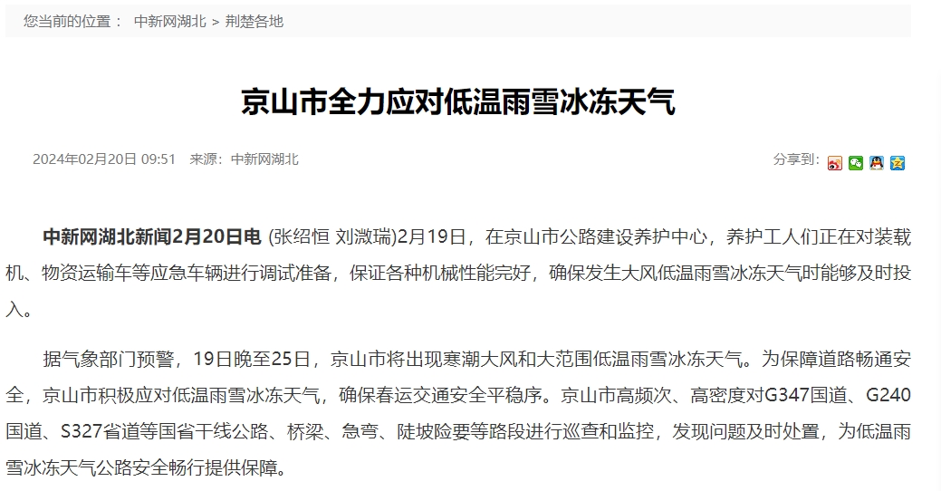 | 【中新網(wǎng)】京山市全力應(yīng)對(duì)低溫雨雪冰凍天氣 |