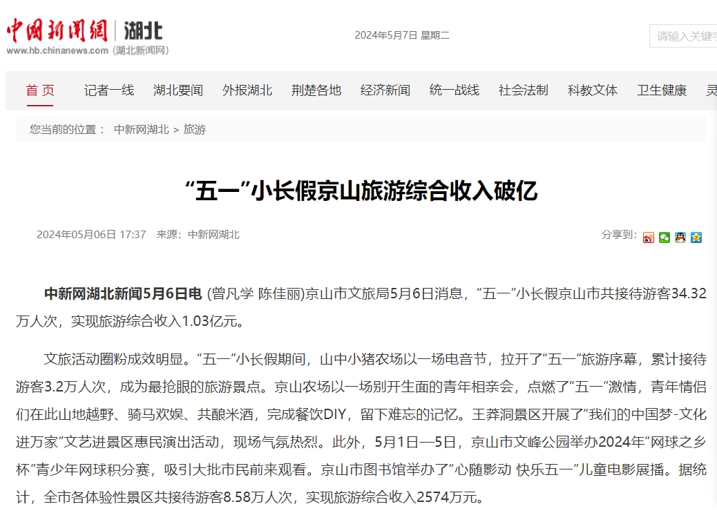 | 【中新網(wǎng)】“五一”小長假京山旅游綜合收入破億 |