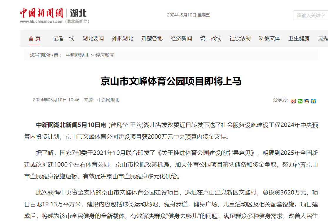 | 【中新網(wǎng)】京山市文峰體育公園項(xiàng)目即將上馬 |