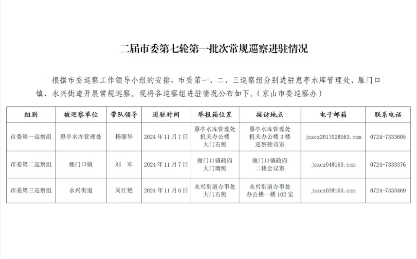 根據(jù)《中國共產(chǎn)黨巡視工作條例》和中央、省委、荊門市委、京山市委關于巡視巡察工作的要求,按照市委巡察工作領導小組安排,于2024年11月6日至12月中旬,對惠亭水庫管理處、雁門口鎮(zhèn)、永興街道開展二屆