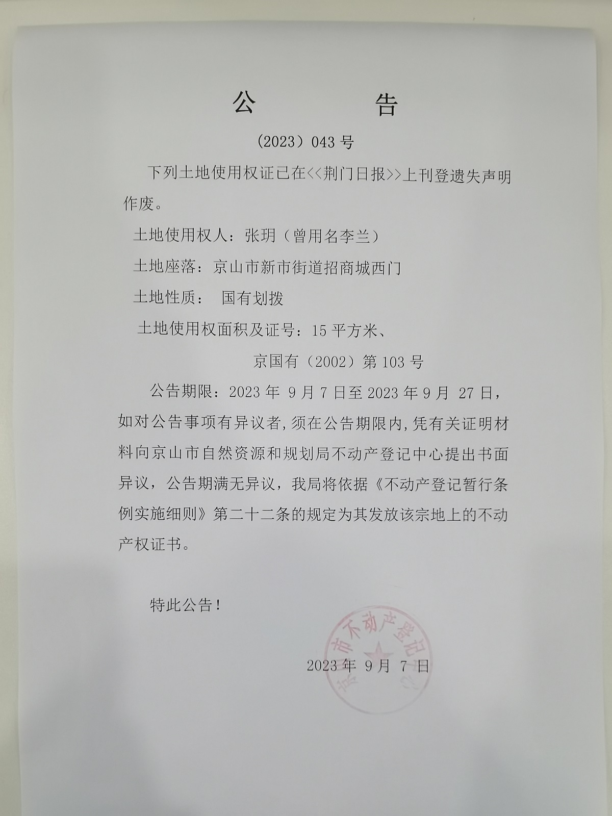 | 京山市宋河鎮(zhèn)第二初級中學(xué)注銷公告 |