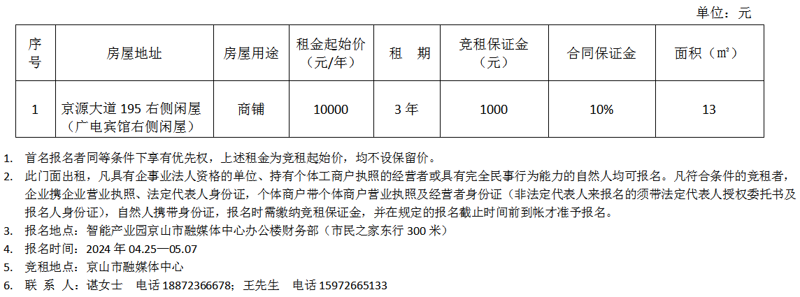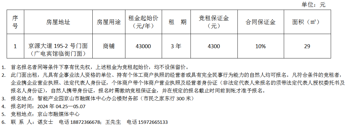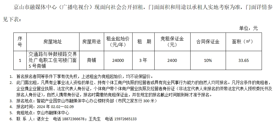 (第一輪)京山市融媒體中心(廣播電視臺)現(xiàn)面向社會公開招租,門面面積和用途以承租人實地考察為準,門面詳情參見下表: