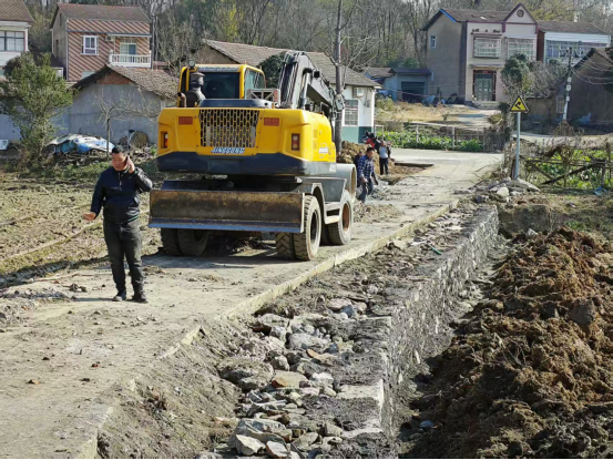12月8日,宋河鎮(zhèn)江關(guān)村三組內(nèi)一派繁忙景象,砌石聲與機(jī)械轟鳴聲交織起伏,施工人員正緊張有序地推進(jìn)作業(yè)。