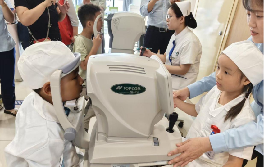 在職業(yè)體驗(yàn)環(huán)節(jié),孩子們穿上迷你白大褂,化身“小小眼科醫(yī)生”,在醫(yī)護(hù)人員的指導(dǎo)下,手持視力表、驗(yàn)光儀為小伙伴們檢查視力。隨后又輪流扮演患者,親身體驗(yàn)眼科檢查的完整流程。“看不見東西太難受了,以后我要好好愛護(hù)眼睛,也想當(dāng)醫(yī)生幫助別人!”小朋友瑩瑩說(shuō)。