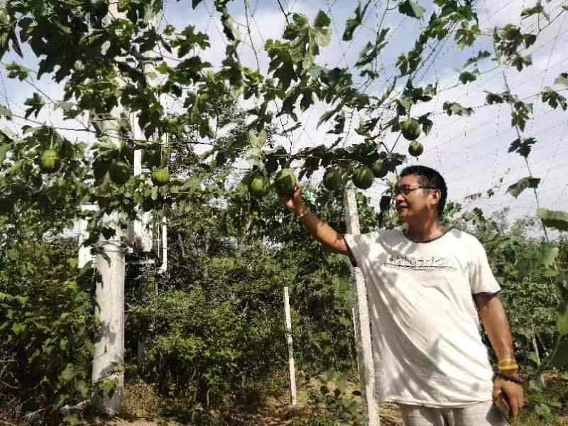 基地負(fù)責(zé)人在看瓜蔞6月30日,溫泉街道五四村樂桃藥材家庭農(nóng)場(chǎng)種植基地,這里呈現(xiàn)出生機(jī)盎然的景象,百余畝瓜蔞種植園內(nèi)綠油油一片,一排排鋼架大棚整齊有序,一行行鋼絲網(wǎng)架錯(cuò)落有致,攀爬的枝藤爬上網(wǎng)架,綠色青