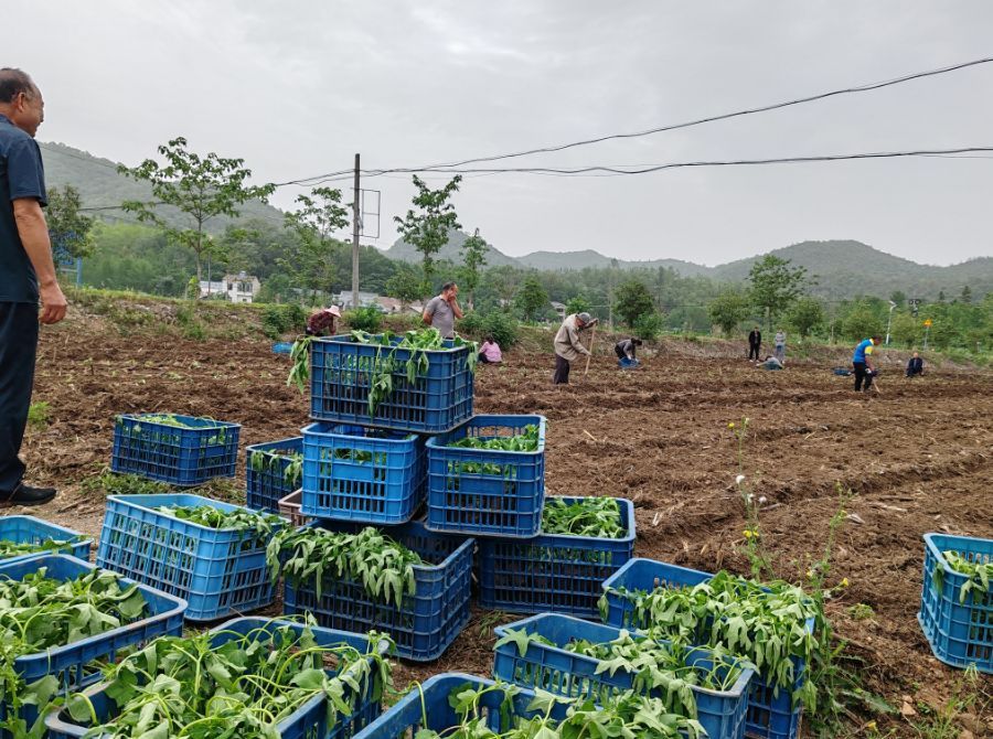 5月21日,在新市街道小煥嶺村二組,村民們正在田間精心栽種蜀葵。