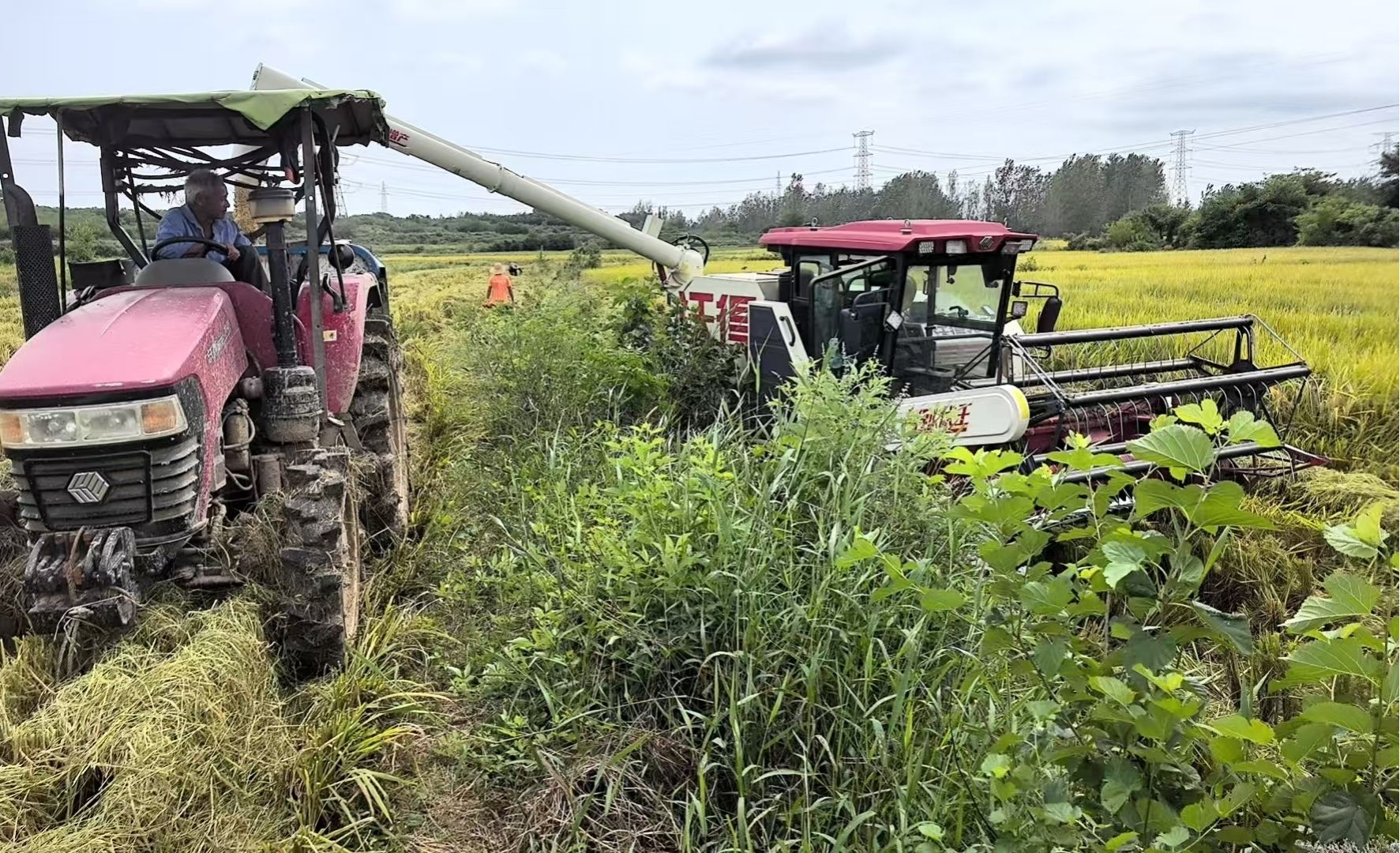 9月16日,在永興街道龔場村六組稻田里,稻穗長勢喜人,豐收在望。村民們正駕駛收割機,在金黃色的稻田間來回穿梭,有序收割。田間地頭機械轟鳴、農(nóng)人忙碌,呈現(xiàn)一派繁忙的景象。