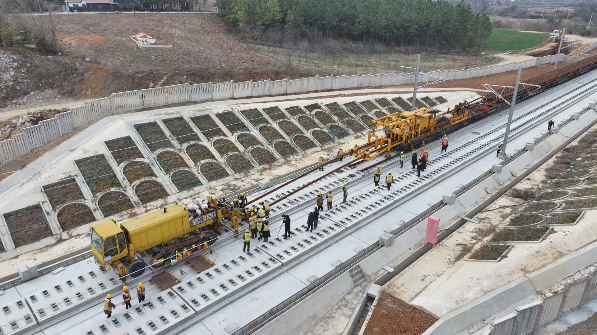 “為確保鋪軌施工順利進(jìn)行,目前共投入機(jī)械設(shè)備鋸軌機(jī)1臺、推送車1臺、牽引車1輛、螺絲機(jī)4臺,自荊門向武漢方向鋪設(shè),每日計劃完成6公里鋼軌鋪設(shè),滬渝蓉高鐵武荊宜雁門口段預(yù)計三天內(nèi)完成鋪軌工作?!?/p>