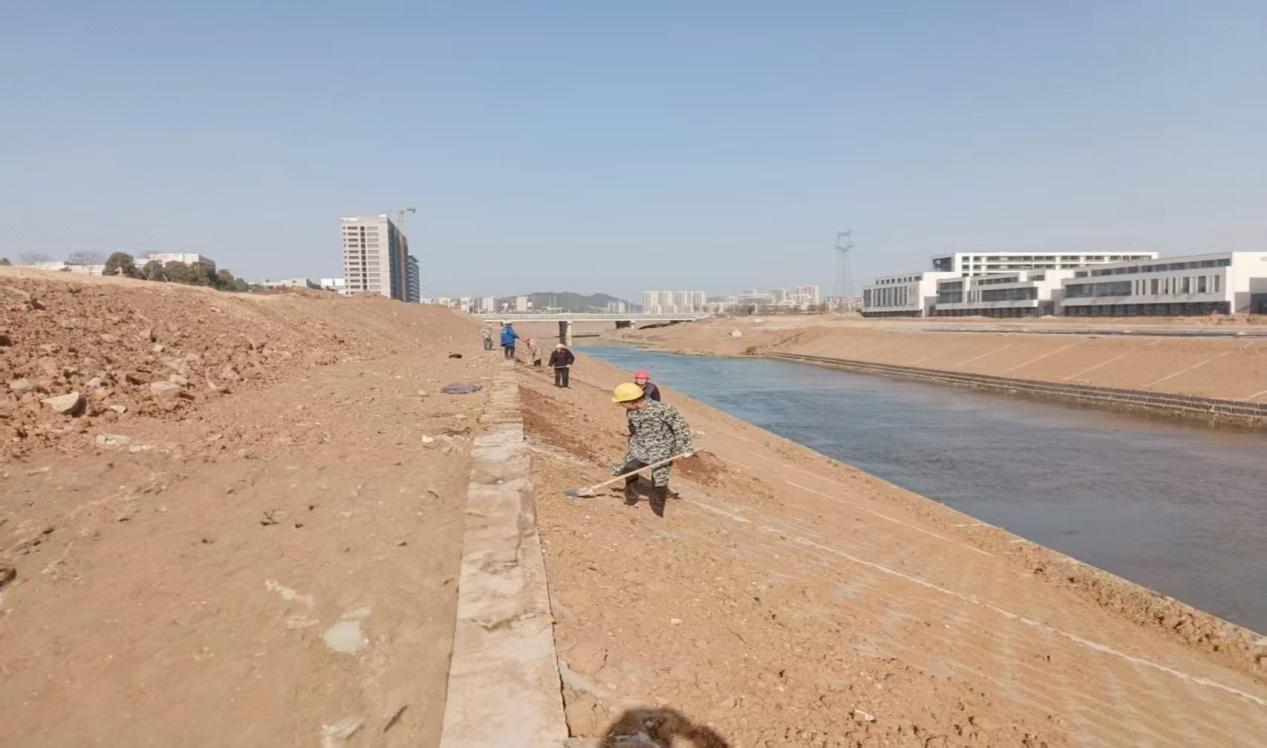 來到京山河母親河復(fù)蘇行動項目施工現(xiàn)場,這里機(jī)械轟鳴,施工正酣。數(shù)臺挖掘機(jī)揮舞巨臂在進(jìn)行著河岸坡面修整,工人們正緊張有序地開展六方磚鋪設(shè)和填土夯實作業(yè),項目全員已切換到節(jié)后全力沖刺的工作狀態(tài)。
