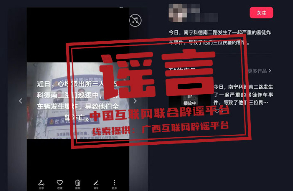 ??真相:近期,有網(wǎng)民在短視頻平臺(tái)上發(fā)布視頻稱“某派出所三人在路口巡邏中,突然車輛發(fā)生爆炸,導(dǎo)致三位民警全部犧牲”。經(jīng)南寧公安部門調(diào)查,該信息為謠言。網(wǎng)民韋某為吸引關(guān)注,杜撰此條謠言信息,并利用手機(jī)進(jìn)行發(fā)布。根據(jù)《中華人民共和國(guó)治安管理處罰法》第二十五條,屬地公安機(jī)關(guān)已依法對(duì)韋某處以行政處罰。(來源:廣西互聯(lián)網(wǎng)辟謠平臺(tái)、南寧網(wǎng)警)