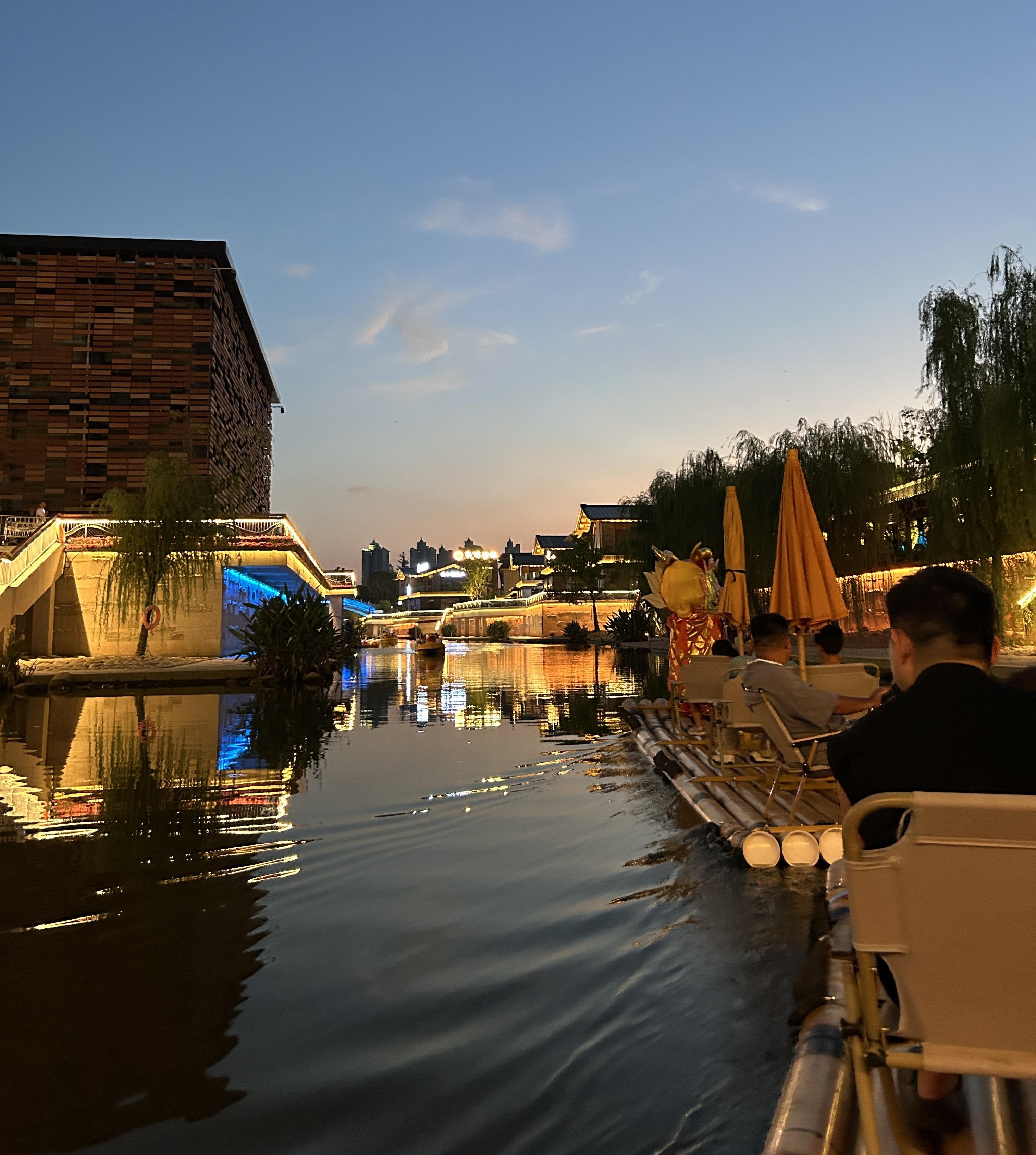 在襄水街里,水上樂園的清涼驅(qū)散了白日暑氣,成了附近居民和小朋友們的歡樂天地,水花飛濺中滿是歡聲笑語。龍游襄水,竹筏緩緩劃過水面,伴著絕美晚霞,吹拂著愜意晚風,感受著夜色里的寧靜與浪漫。