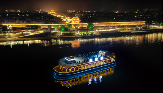 在漢江游輪上,“水上劇場”帶來由襄陽本土文化典故改編成的《漢水女神傳說》歌舞劇,與“郭靖黃蓉”真人秀等節(jié)目相結(jié)合,讓游客在槳聲燈影中觸摸襄陽的古典浪漫。