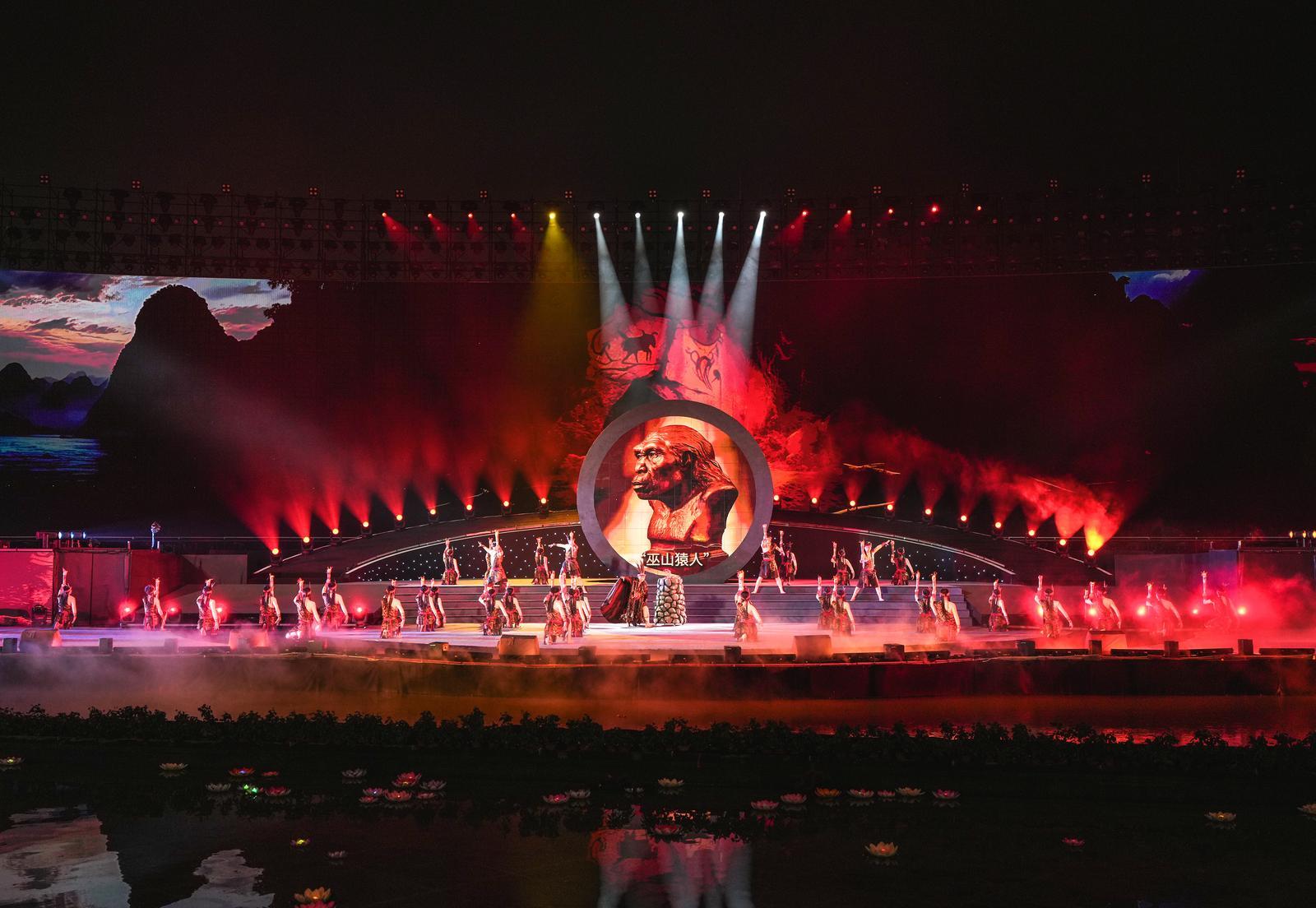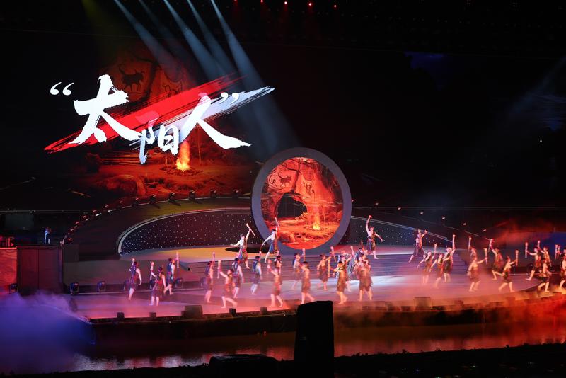 燈光漸隱,時空回溯,觀眾遁入蒼茫遠古?!拔咨皆橙恕薄伴L陽人”“太陽人”石刻等依次登場。創(chuàng)意舞蹈《太陽人》以時間為軸,舒展開長江三峽的文明史詩。
