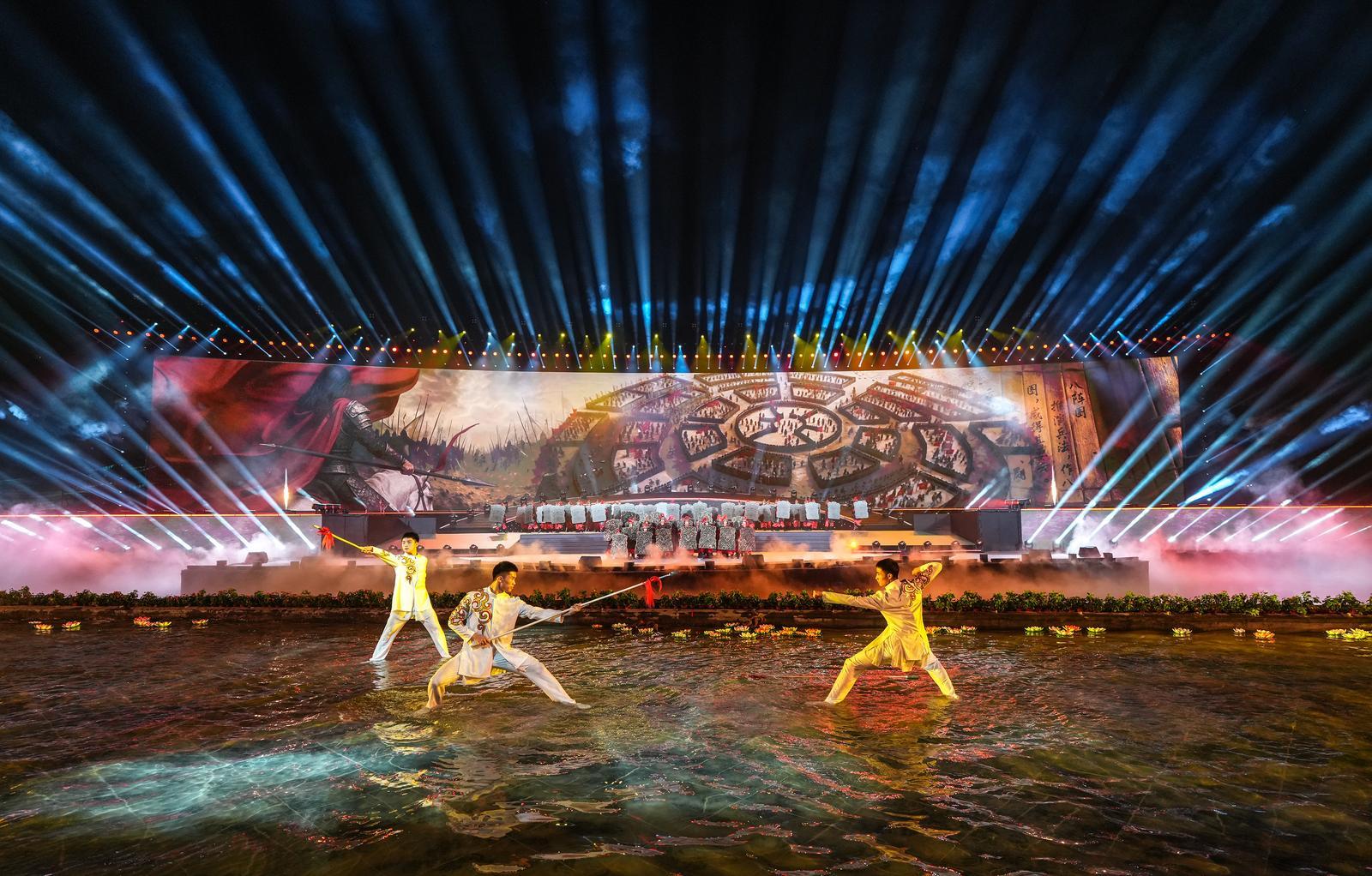 水上舞臺,波光粼粼。前區(qū),白衣武者執(zhí)矛起舞,剛柔并濟;中區(qū),鎧甲舞者持盾列陣,氣勢如虹。空中,無人機群與舞臺默契呼應,變換出古老神秘的“八陣圖”,再現(xiàn)諸葛亮運籌帷幄、決勝千里的智謀傳奇……