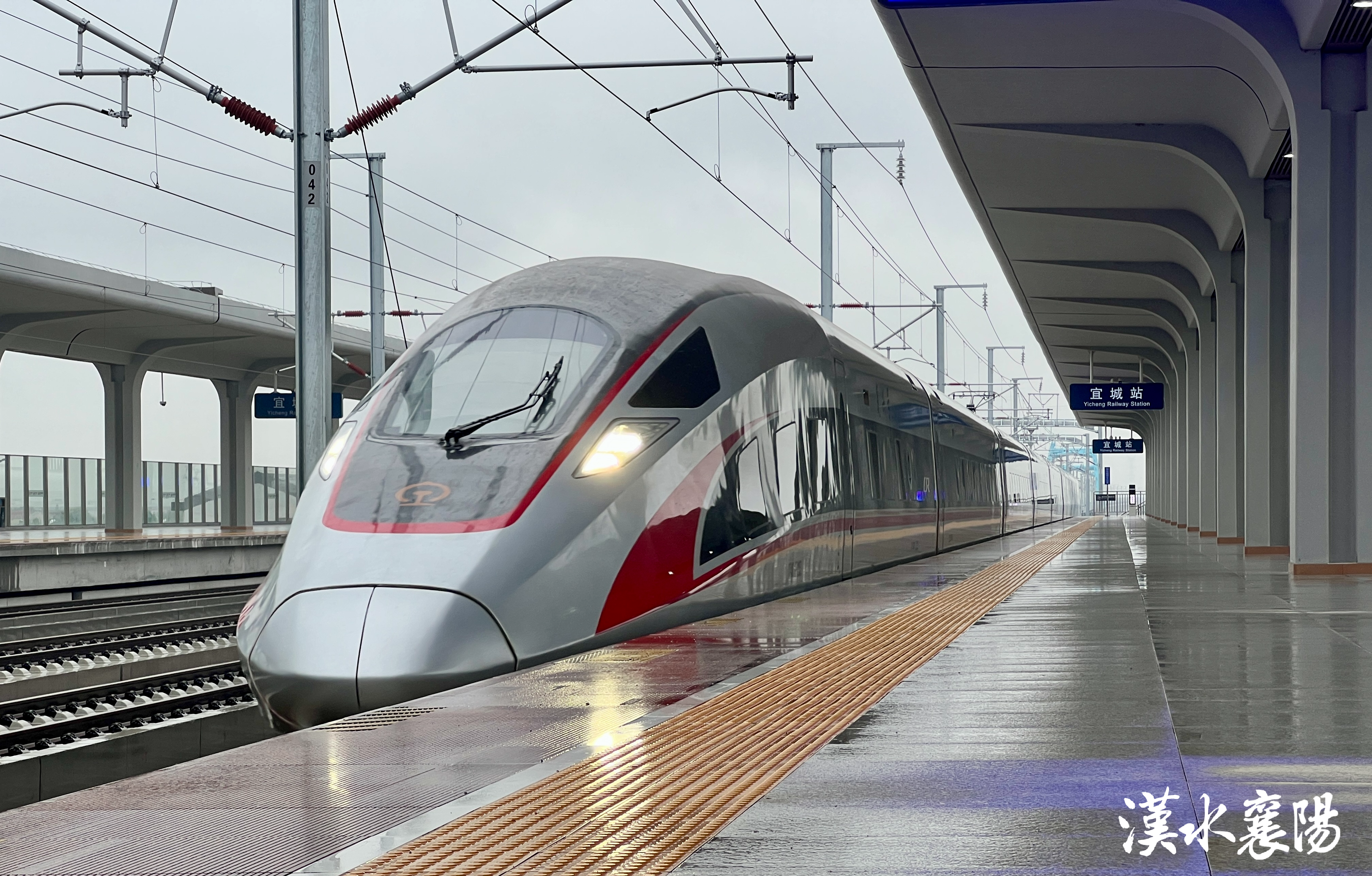 ▲襄荊高鐵試運行動車組駛?cè)胍顺歉哞F站