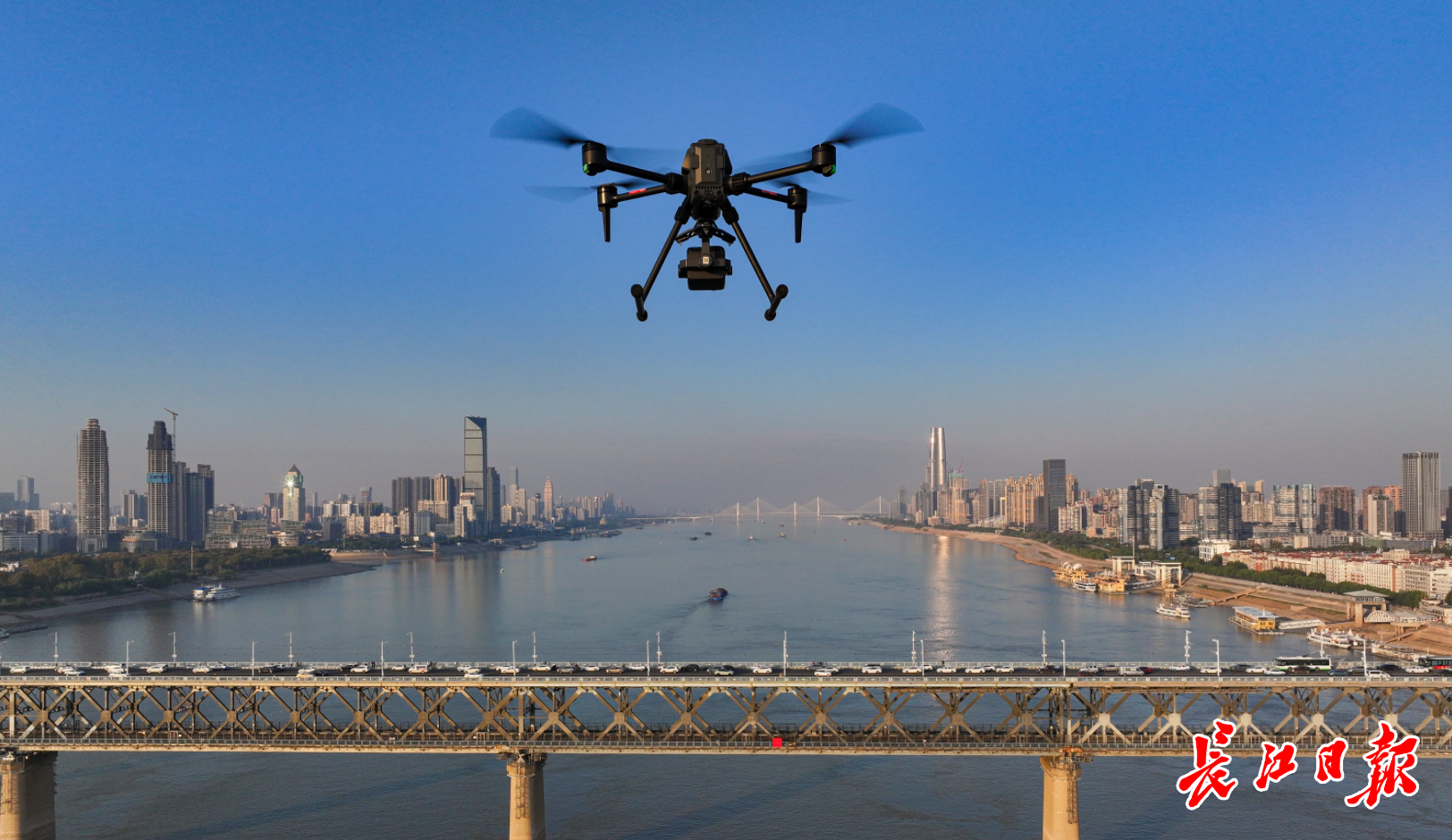 普宙科技無人機(jī)在武漢長江大橋上空往上、下游方向進(jìn)行測繪、巡檢。 長江日報(bào)記者胡冬冬 攝