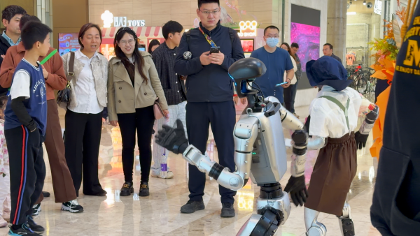 會跳舞的人形機(jī)器人要轉(zhuǎn)場漢交會為嘉賓端茶倒水。許玲 攝